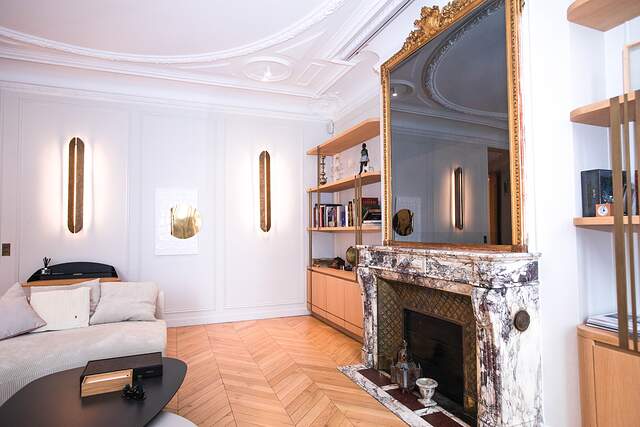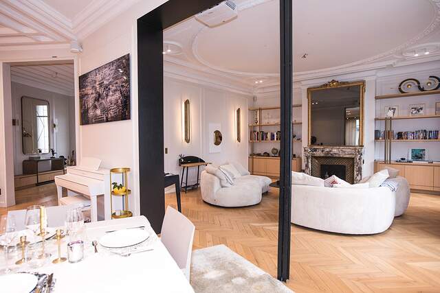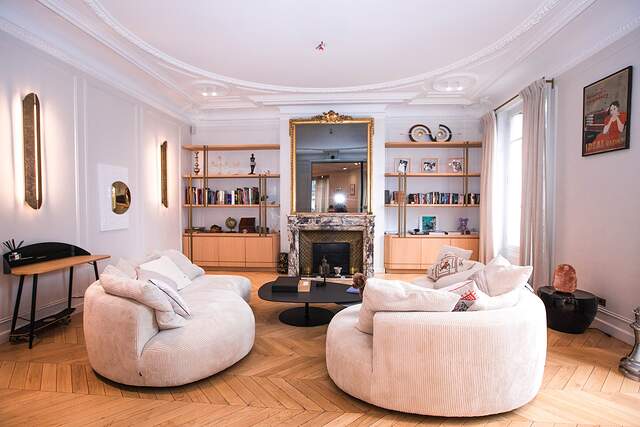 C'est un appartement de style haussmannien classique avec du parquet et de hauts plafonds décorés.