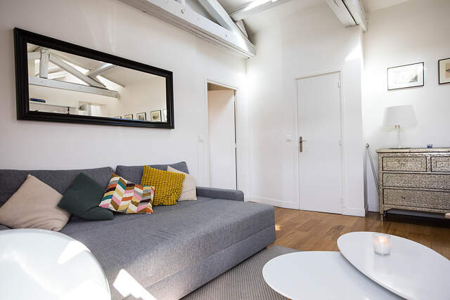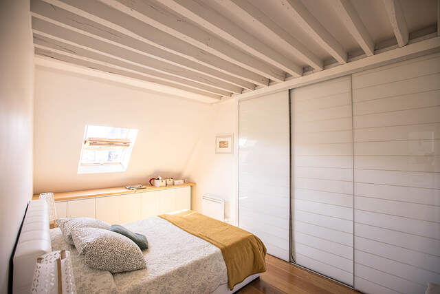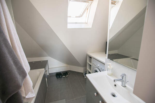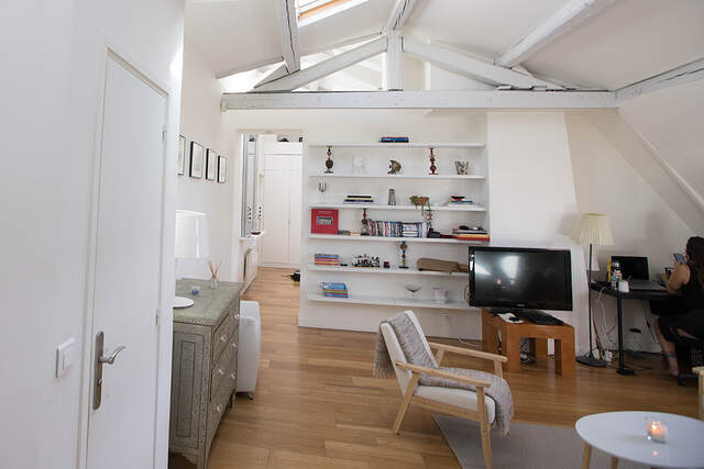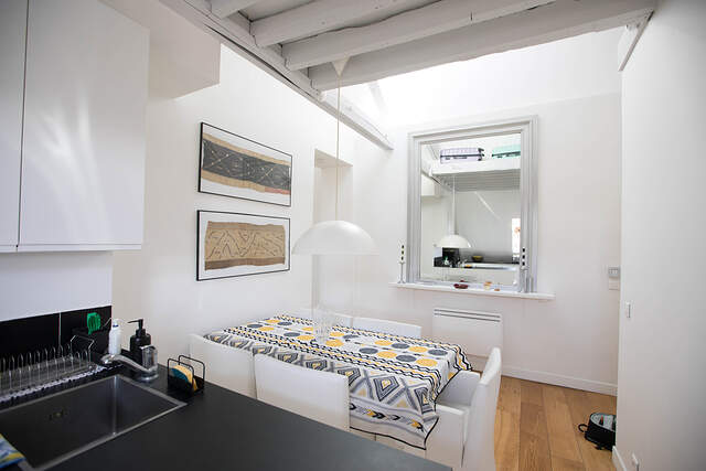 Il offre près de 40 m² de surface habitable au 4e étage (sans compter le rez-de-chaussée) d'un immeuble doté d'un ascenseur, d'un concierge et d'un parking.