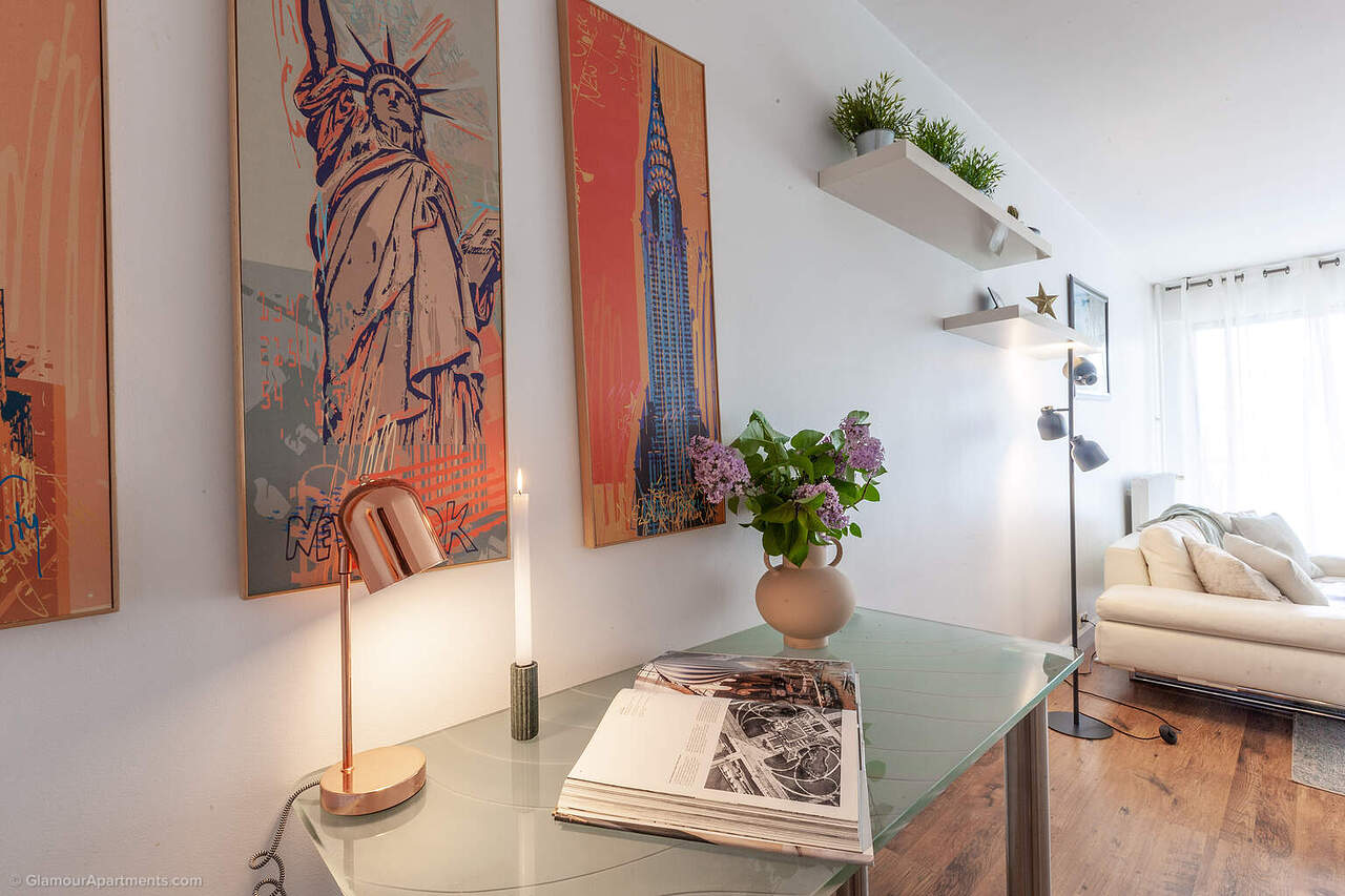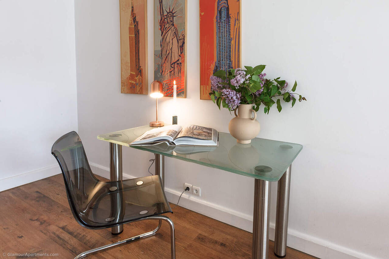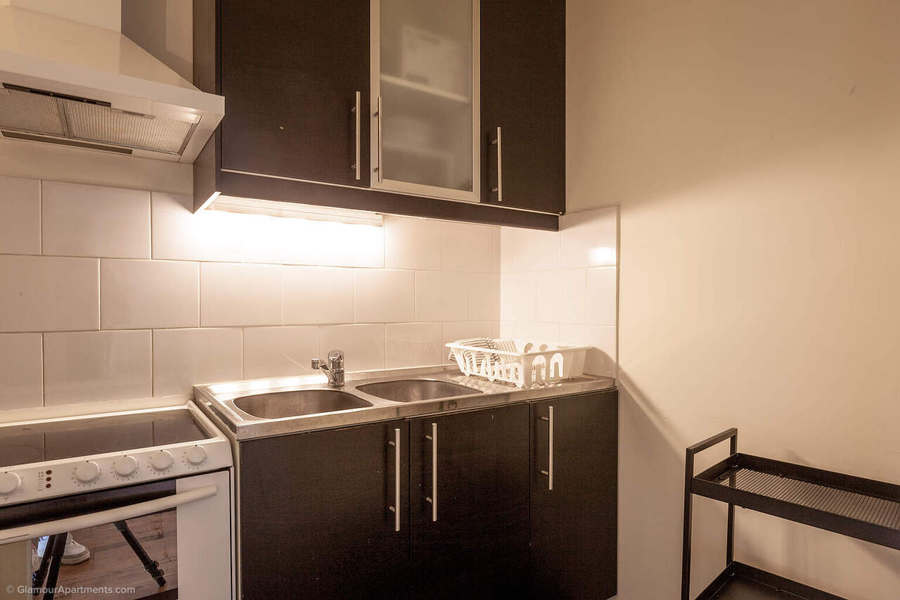 La pièce principale réunit séjour et espace nuit, avec la possibilité d’installer un coin bureau, tandis que la cuisine séparée est entièrement équipée avec tous les appareils nécessaires. Des finitions claires et de grandes fenêtres renforcent la sensation de volume et rendent le studio très fonctionnel.