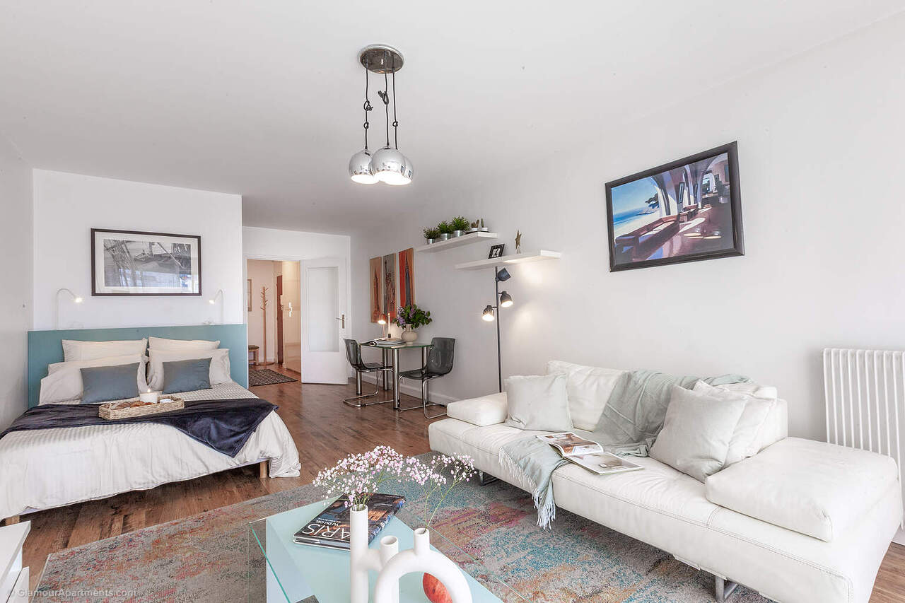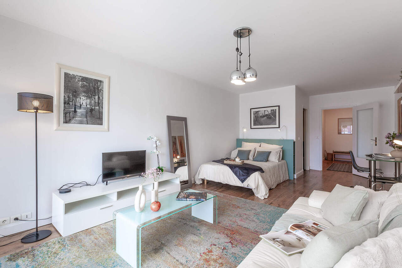 Studio situé dans le 6ᵉ arrondissement de Paris, dans la calme rue d’Assas, à quelques pas du jardin du Luxembourg et du boulevard Saint‑Germain.